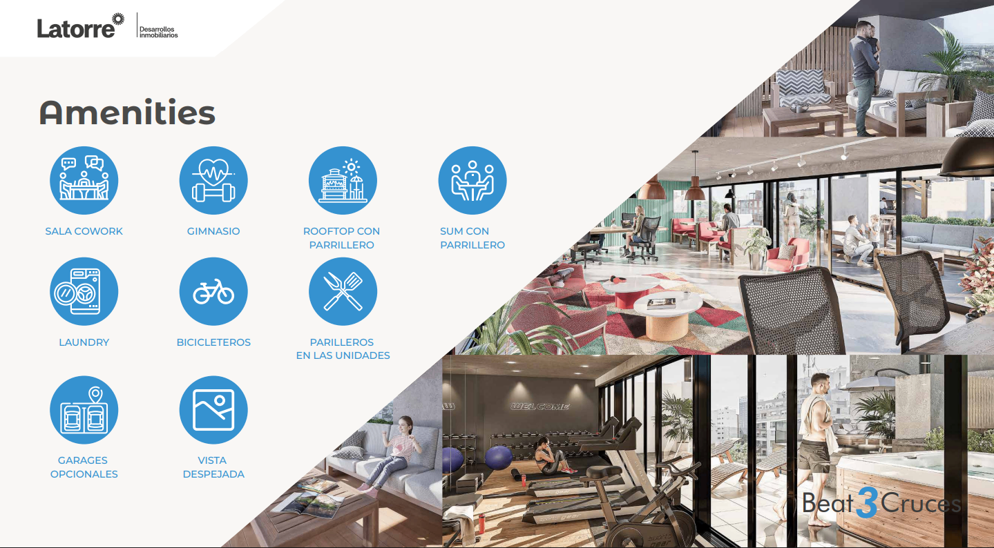 Cada unidad en BEAT TRES CRUCES está equipada con características modernas que incluyen aire acondicionado, conexión a internet, y una variedad de espacios comunes como salón de usos múltiples, solarium y juegos recreativos. Además, el edificio cuenta con seguridad integral, cámaras CCTV, portón automático y rampas para sillas de ruedas, asegurando un entorno seguro y accesible para todos sus residentes. La ubicación estratégica ofrece fácil acceso a transporte público y diversas vías de comunicación, convirtiendo a este emprendimiento en una excelente oportunidad de inversión en Montevideo.