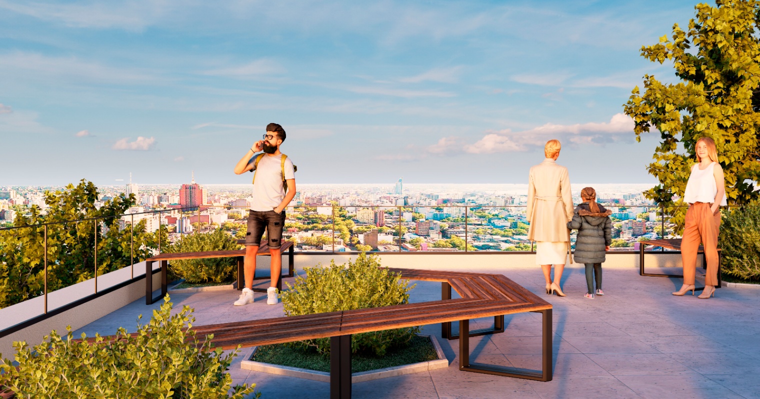 En el nivel 12 se disfruta una vista panorámica a la ciudad, un parrillero abierto de grandes dimensiones, solárium orientado al norte, lavadero, tender y servicios higiénicos. Además, el edificio incorpora una huerta orgánica de especias para uso común.