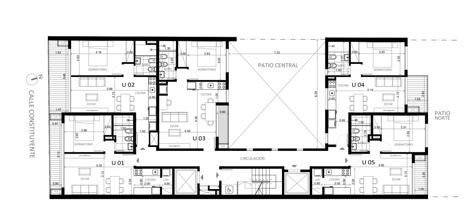En planta baja cuenta con hall de recepción, patio con acceso y estacionamiento para bicicletas, y un salón de usos múltiples con parrillero y terraza abierta.
